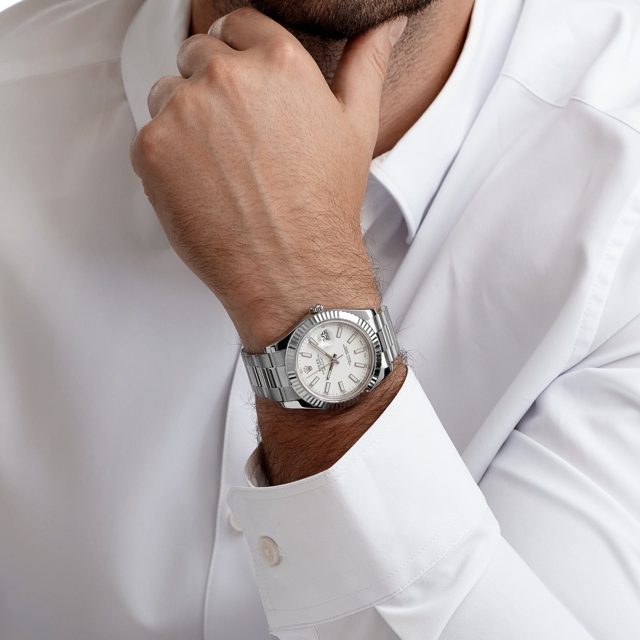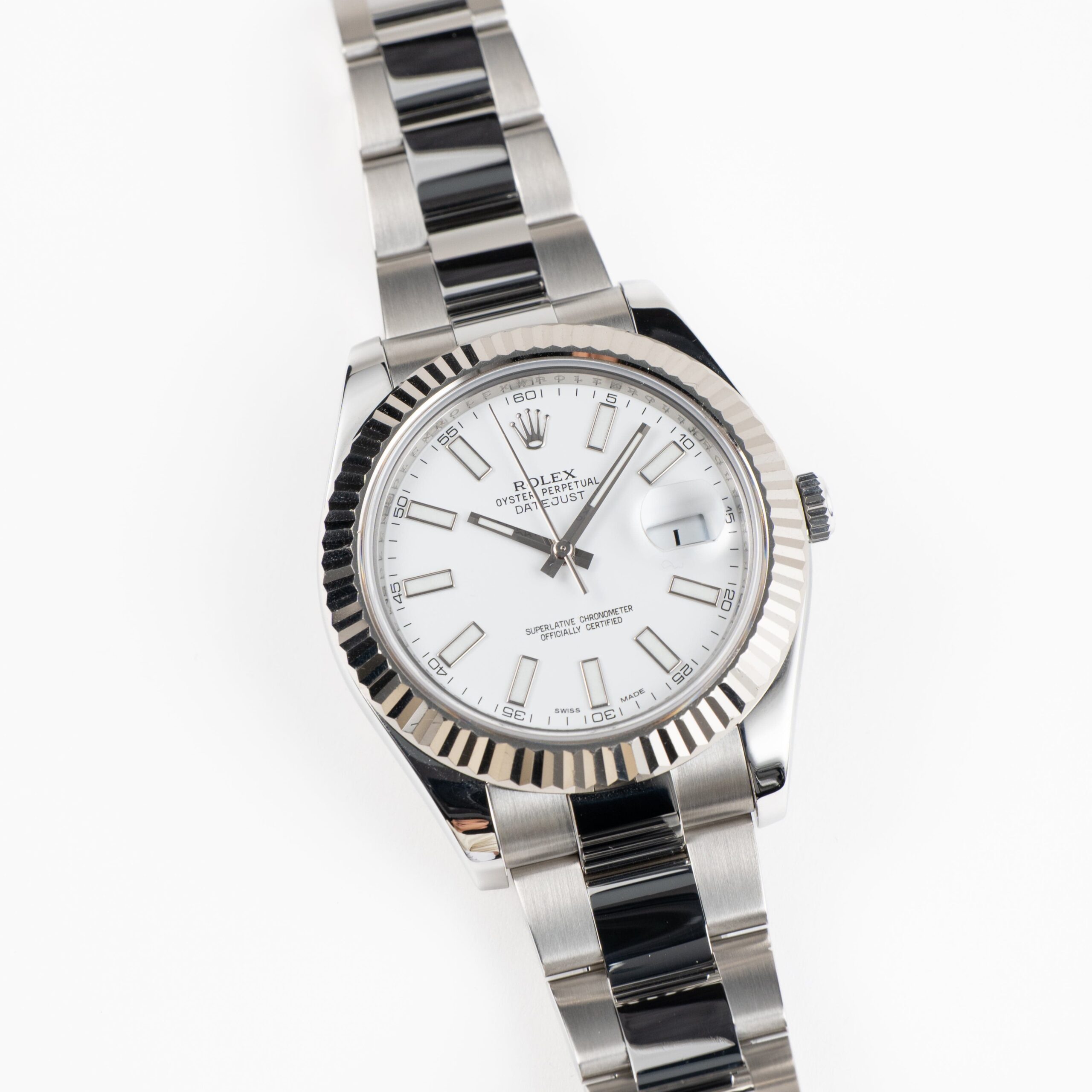 The Rolex Datejust 41 116334 presents the classic Datejust design in stainless steel, giving the watch a balanced 41 mm case size that suits both modern and traditional tastes. The crisp white dial adds understated elegance, while the white gold fluted bezel and stainless steel Oyster bracelet emphasize everyday wearability and versatility.
