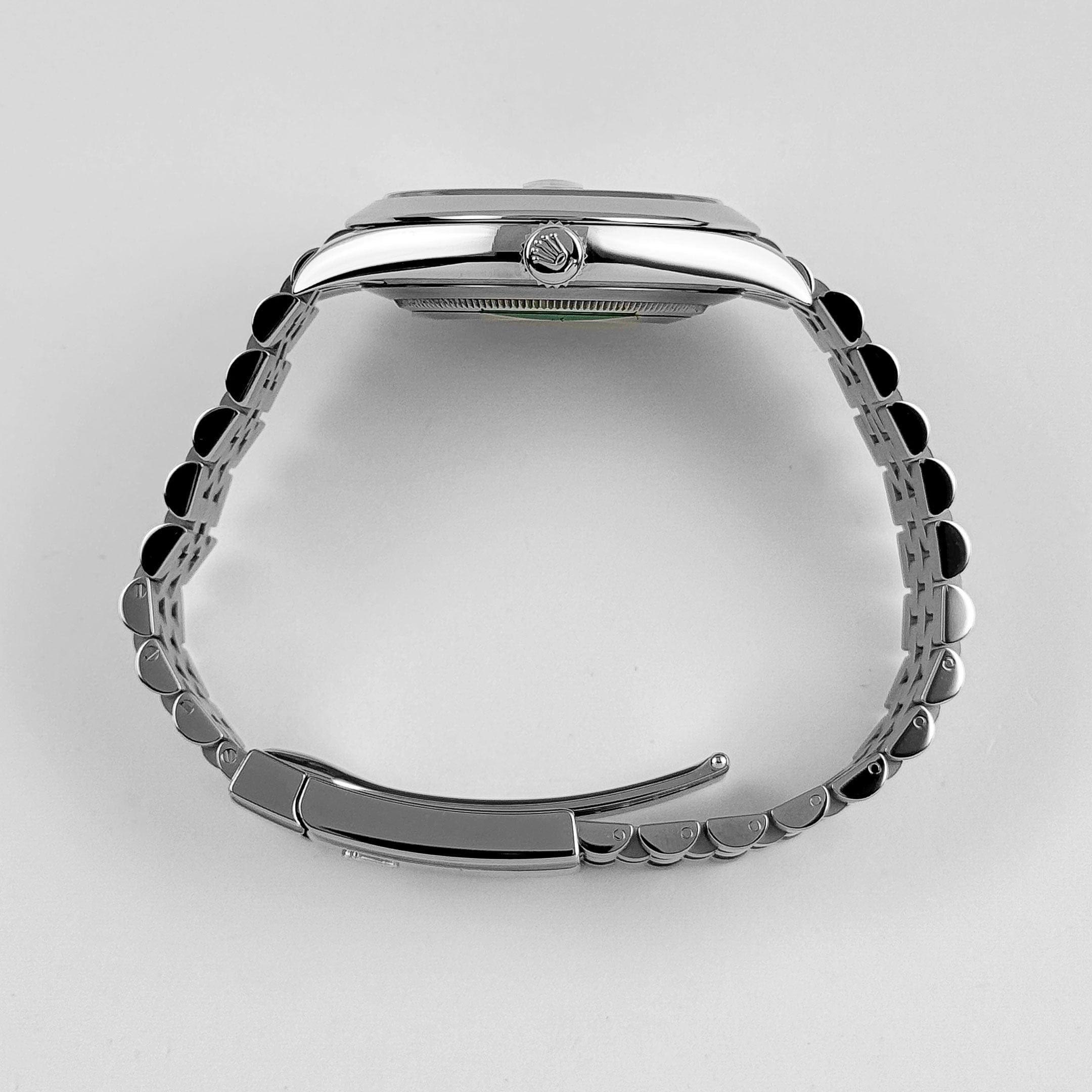 Mounted on the Jubilee bracelet, the 126300 balances everyday versatility with subtle luxury. Unlike its two-tone counterparts, this all-steel configuration emphasizes modern restraint, allowing the striking green dial to take the spotlight.