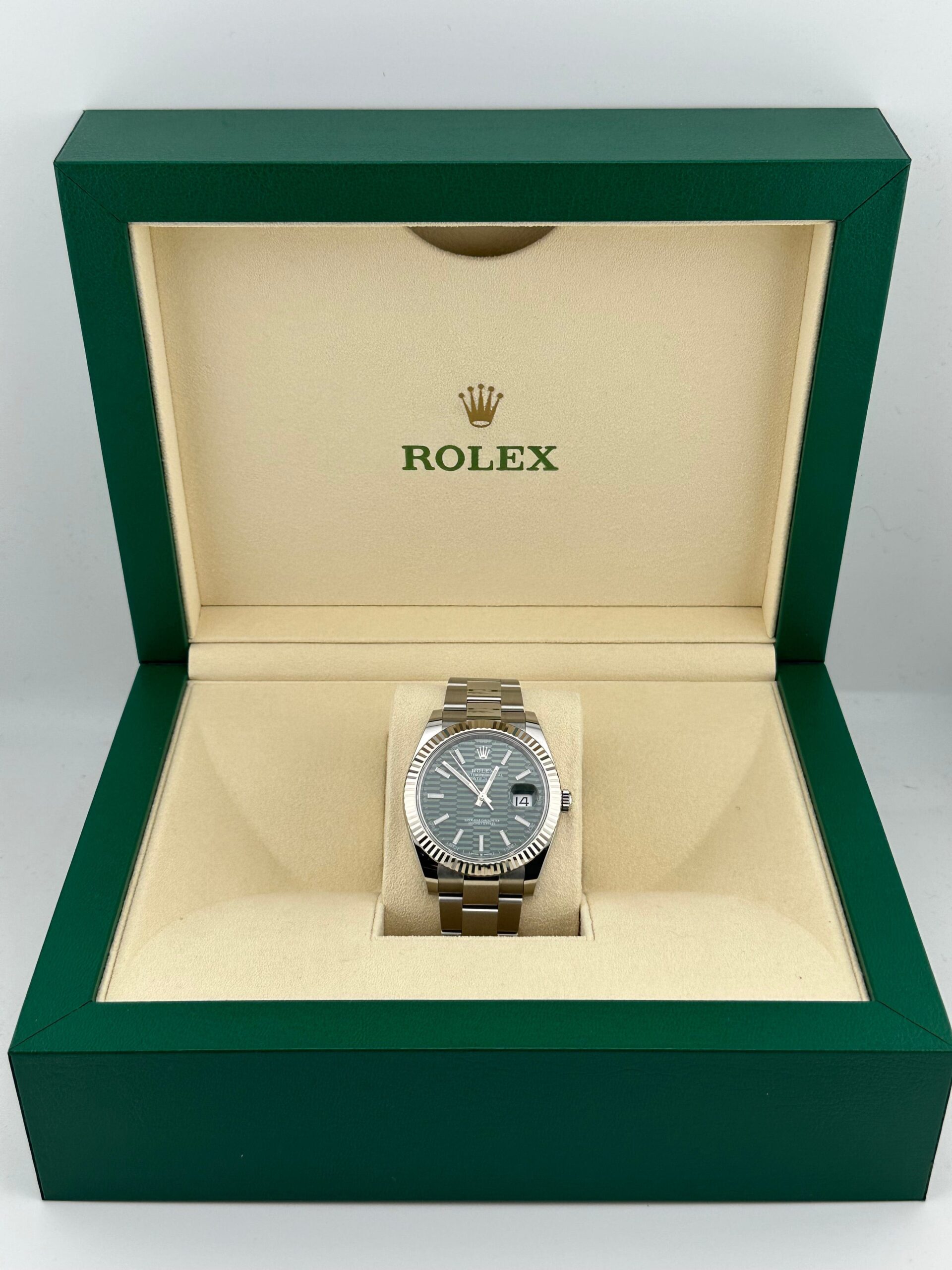 The Rolex Datejust 126334 is a stunning combination of timeless design and contemporary style, crafted in stainless steel with a 41mm case. Its smooth, modern aesthetic is elevated by a fluted bezel in 18k white gold, adding a touch of elegance. The standout feature is the green palm motif dial, showcasing intricate, nature-inspired patterns that lend a unique and vibrant character to this iconic timepiece.