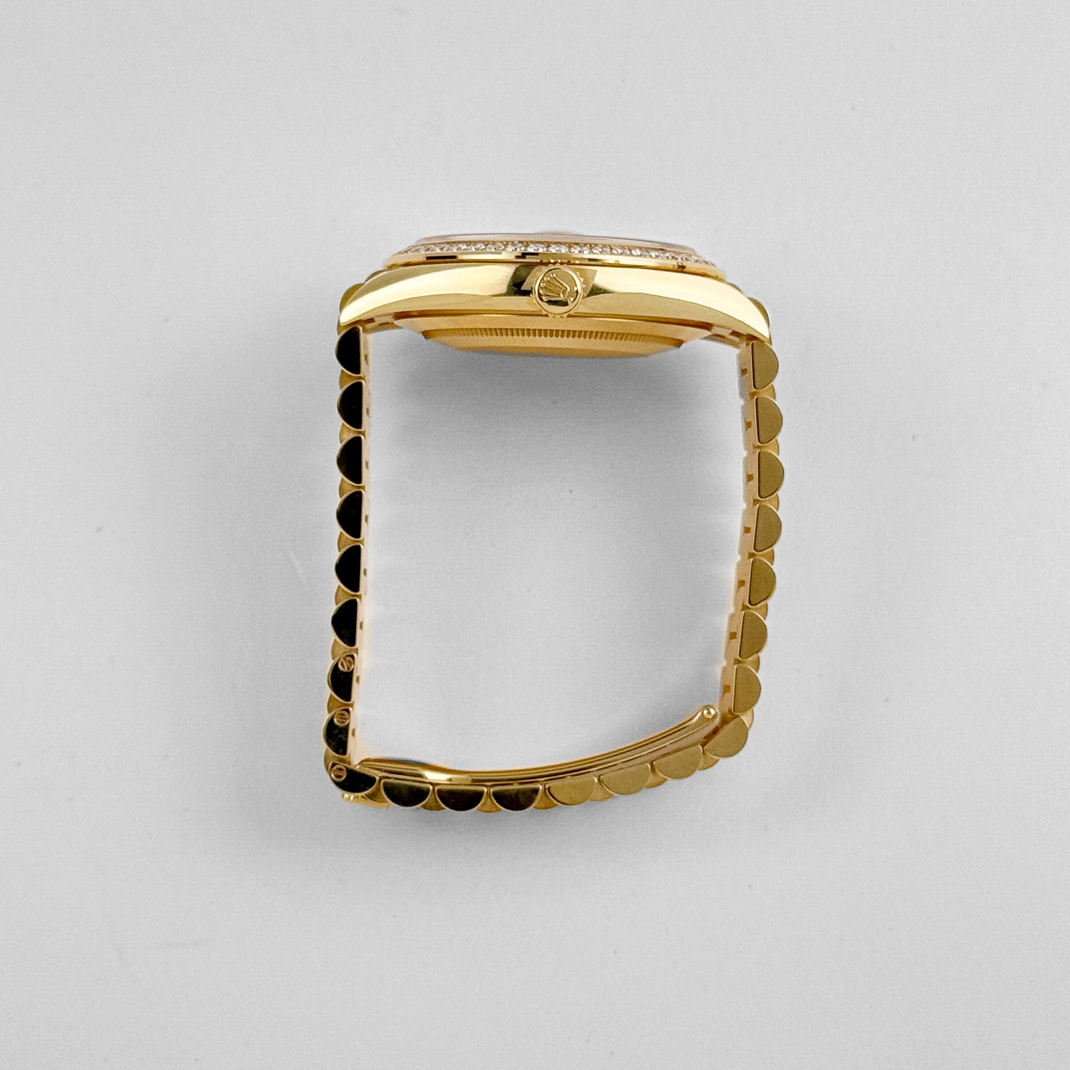 The Rolex Day-Date 40 228348RBR represents an elevated fusion of craftsmanship and elegance. Crafted in 18k yellow gold, its 40 mm case is framed by a diamond-set bezel that conveys subtle grandeur. The dial is meticulously paved with brilliant-cut diamonds and accented by baguette-hour markers, ensuring the Day and Date functions stand out with luminous clarity and decorative precision.