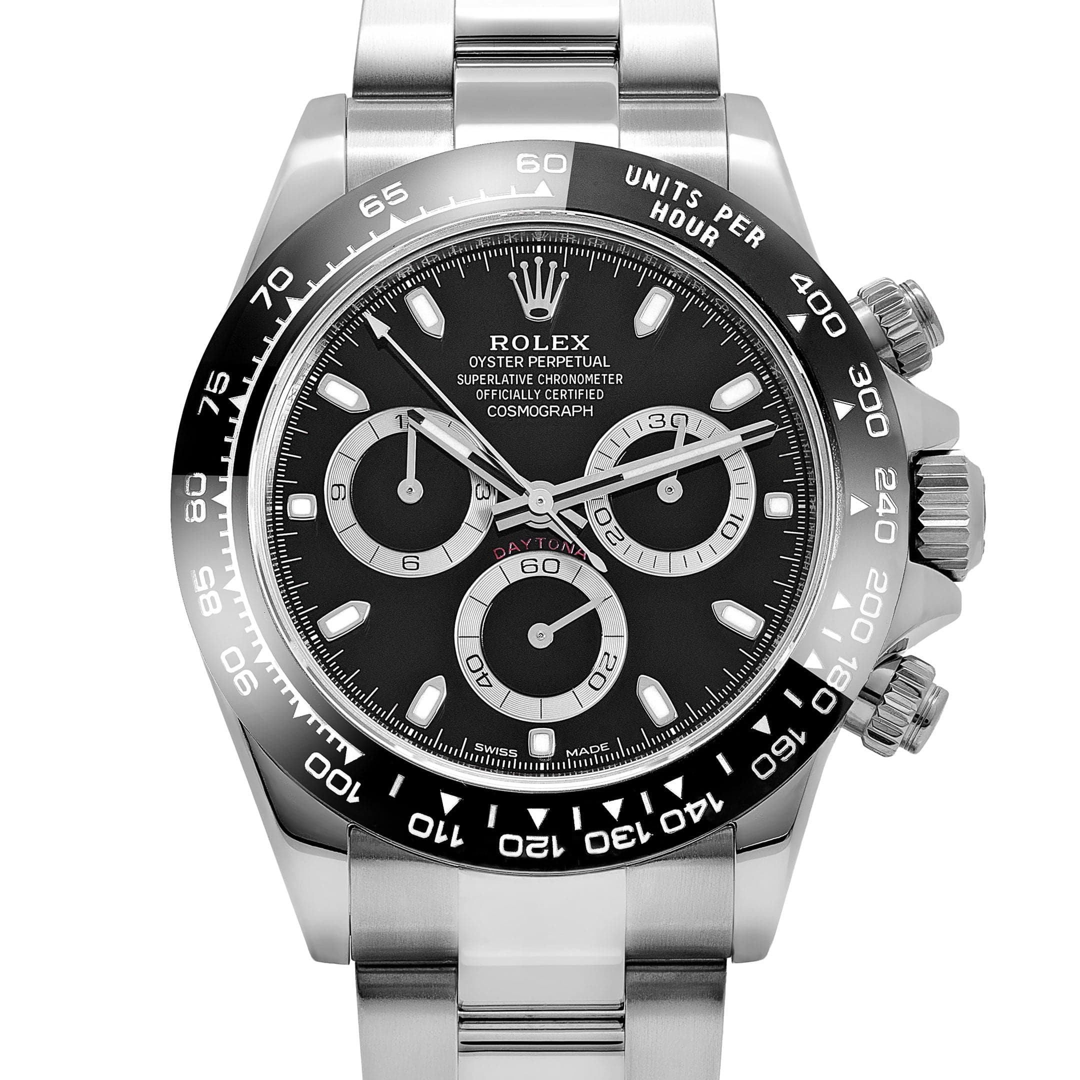 At 40mm, the stainless steel case and Oyster bracelet give it everyday versatility, while the ceramic bezel preserves the reference’s sporty identity without overwhelming its refined proportions. The black dial’s simplicity and clarity make it easy to wear in both casual and more formal settings, and its position in the Daytona lineage has helped cement its appeal across generations of enthusiasts. For collectors who value classic chronograph design in stainless steel with modern material upgrades, the 116500LN stands out as a benchmark reference.