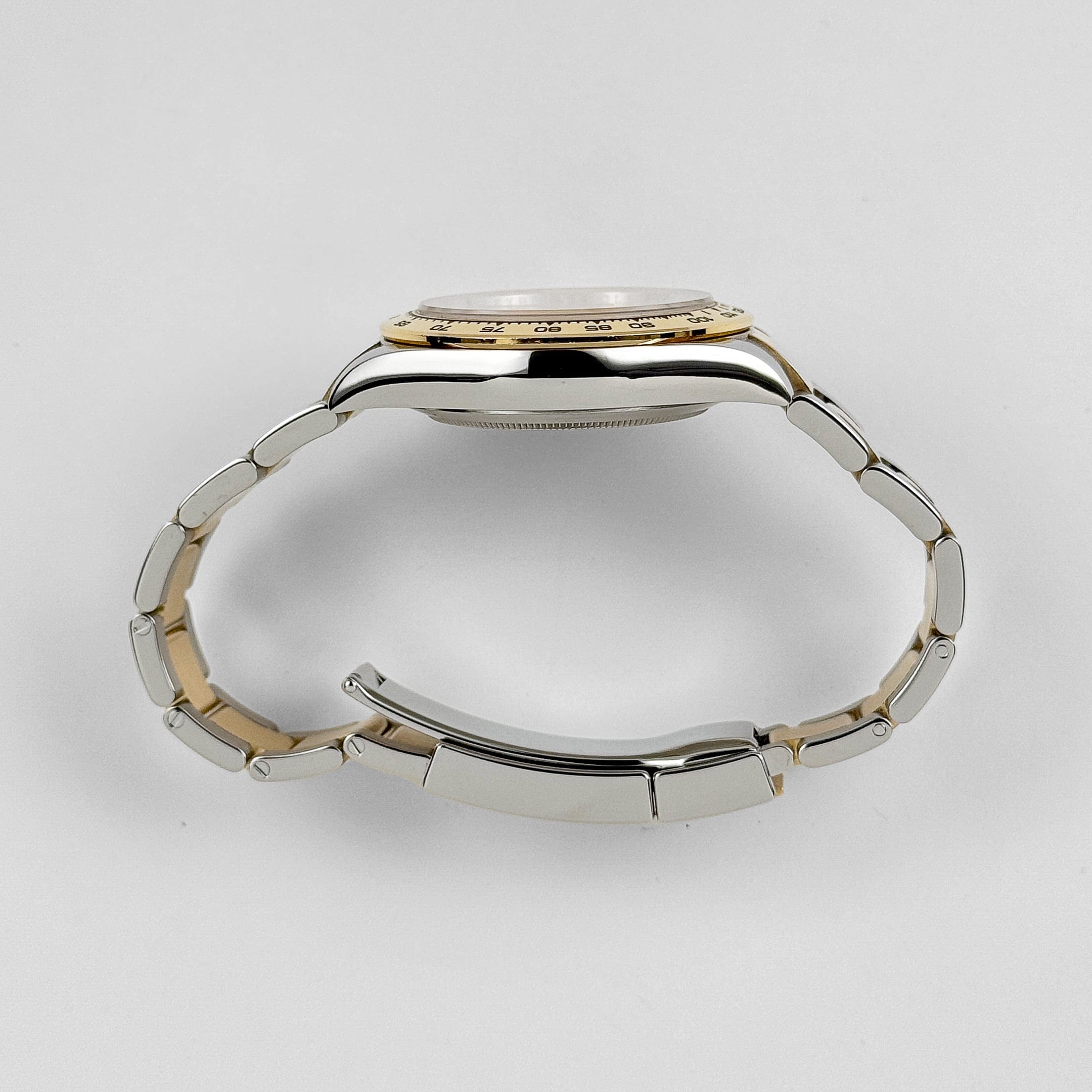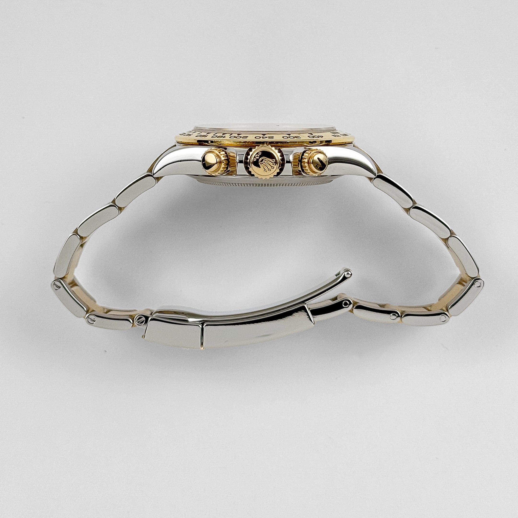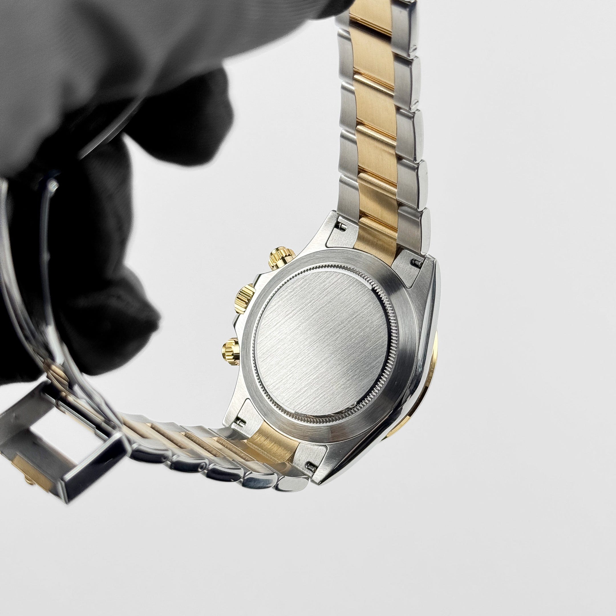 The Rolex Daytona 116503 exudes sporty elegance, with a stainless steel 40mm case and yellow-gold bezel with an engraved tachymeter scale. At the center lies a mesmerising black mother-of-pearl dial—each one with natural, iridescent variation—adorned with brilliant diamond hour markers and accented by gold subdial rings that enhance both luxury and legibility.