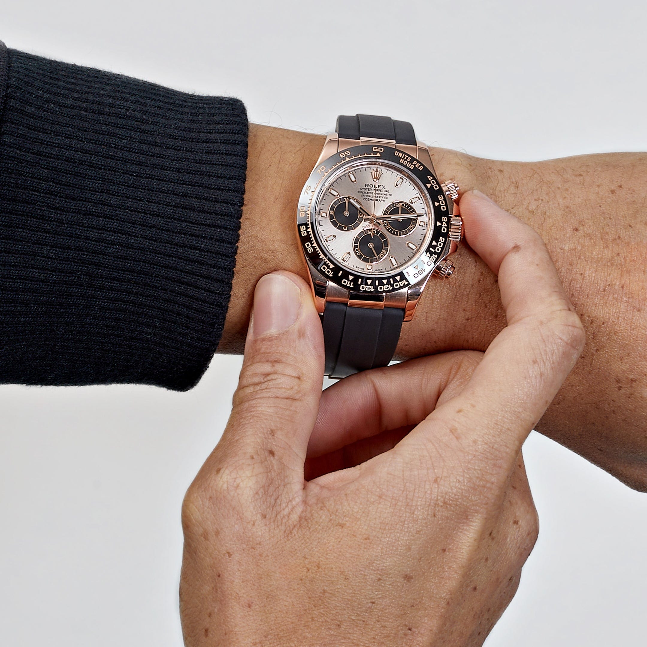 Luminous hour markers and hands ensure excellent legibility, while the chronograph functionality delivers precision timing for high-performance use. Paired with the innovative Oysterflex bracelet, which combines the durability of elastomer with a flexible metal core, the Daytona 116515LN offers exceptional comfort and a modern edge.