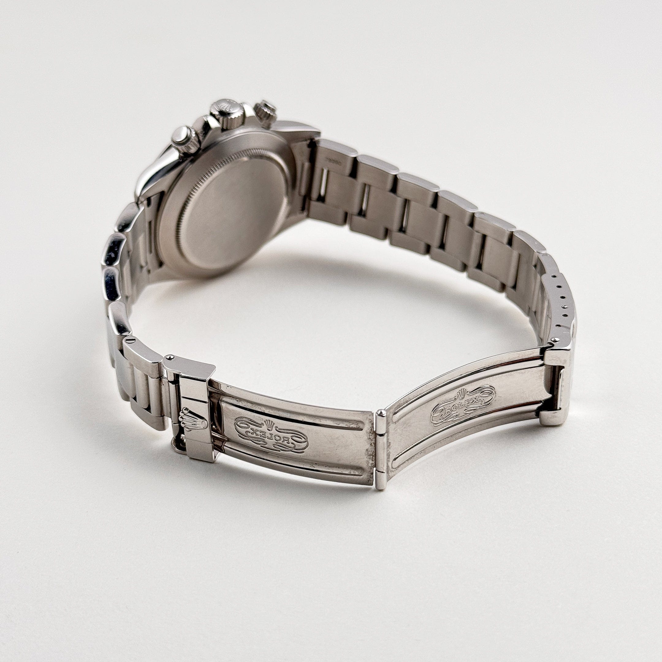 The Rolex Daytona 16520 with the black Patrizzi dial is a highly coveted collector’s piece, blending the iconic design of the Zenith-era Daytona with a rare and desirable dial variation. Crafted from stainless steel, the 40mm case features the signature engraved tachymeter bezel and robust construction that defines the Daytona lineage. What sets this particular example apart is its Patrizzi dial—named after a watch collector who first noted the unique aging effect of the subdials. Over time, the originally white subdials develop a warm, creamy patina, creating a rich contrast against the black background and giving each piece a unique, vintage character.