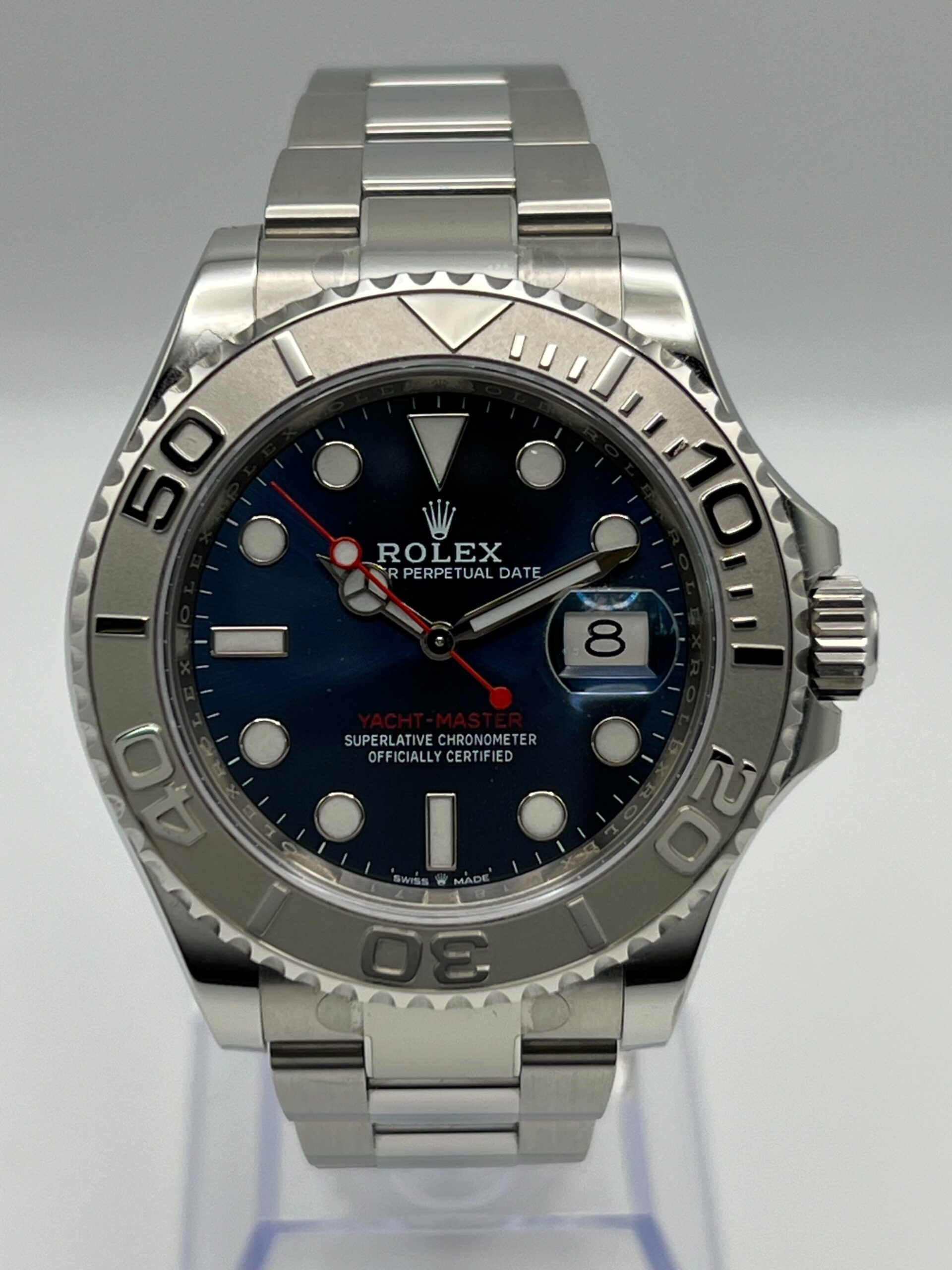 The Rolex Yacht-Master 40 ref. 126622 pairs its maritime heritage with understated elegance in a 40 mm stainless steel case topped by a platinum bezel — the “Rolesium” construction giving it both durability and distinct luxury character. The sunburst blue dial adds vivid personality while remaining refined, and the Oyster bracelet offers integrated style with everyday comfort.
